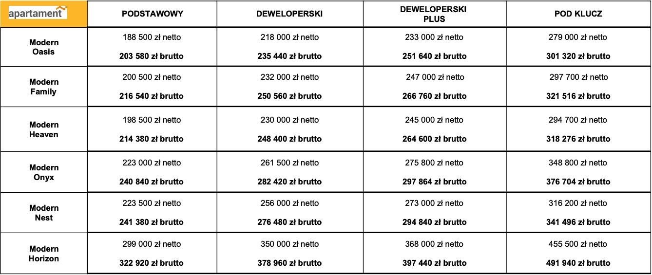 - Pakiet " Deweloperski Plus ":275 800 zł netto (VAT 8%), czyli 297 864 zł brutto