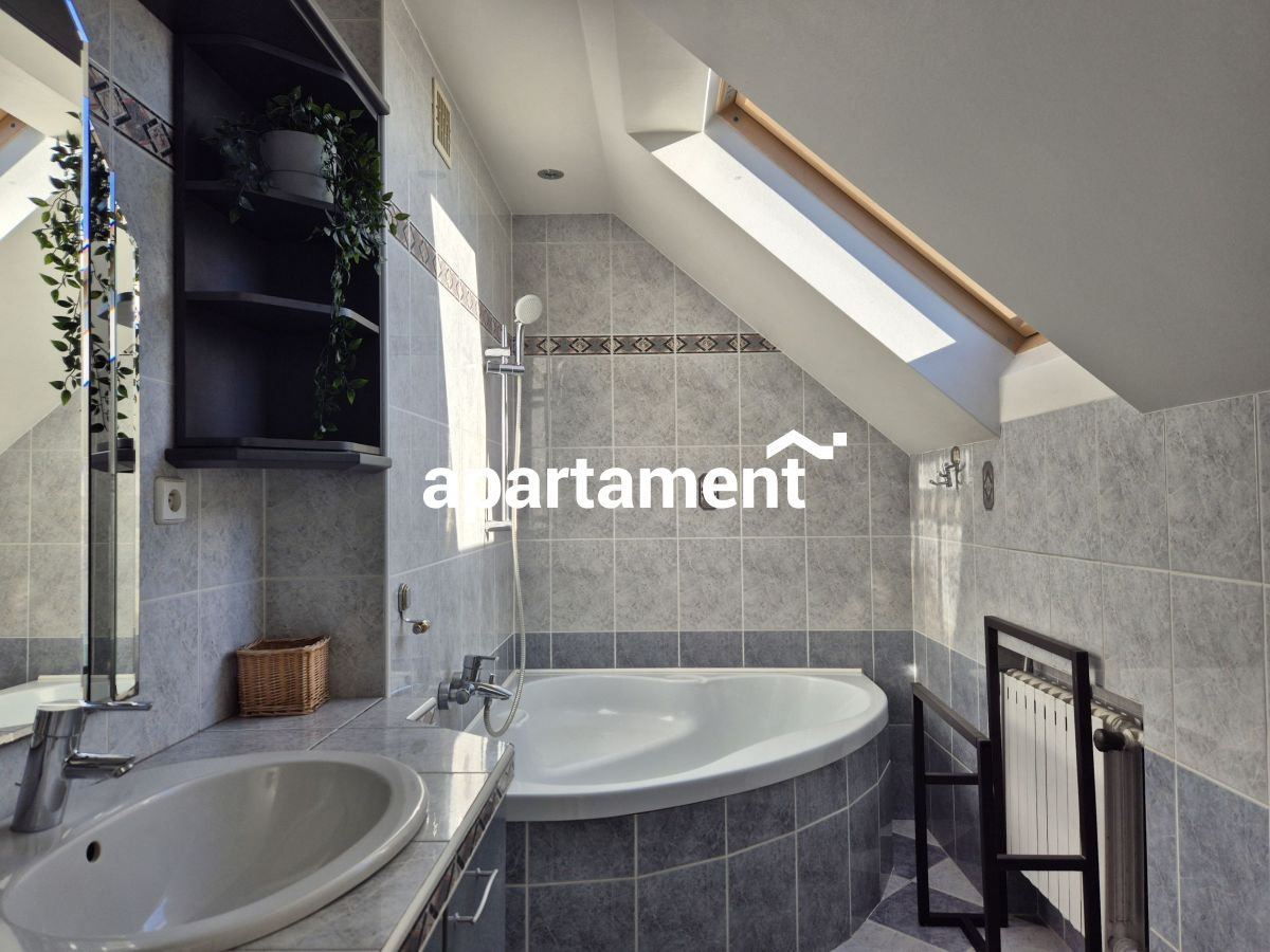 Na piętrze mieści się przestronna sypialnia, pokój z własnym wyjściem na taras, kolejny pokój oraz druga łazienka z WC. Warto podkreślić, że na tym poziomie zamontowano klimatyzację, zapewniającą komfort nawet podczas gorących dni. W piwnicy zaś znajduje się w nowoczesny piec c.o. z zasobnikiem na wodę (z 13-letnią gwarancją) oraz stacja uzdatniania wody, co gwarantuje niskie koszty eksploatacji i wysoką funkcjonalność.