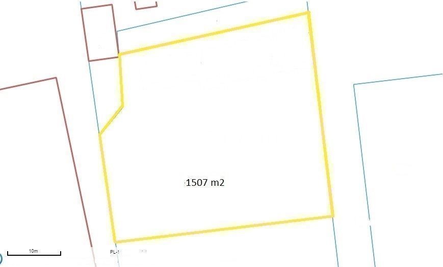 Działka w kształcie kwadratu, o wymiarach około: 37x39. Wokół zabudowa jednorodzinna, niedaleko las.