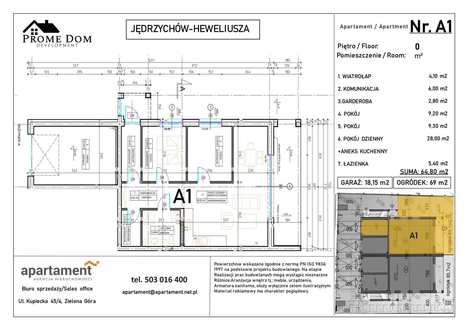 Układ pomieszczeń mieszkanie z ogrodem A1- Parter o pow. 82,95m2. (64,8 m2 plus garaż-18,15 m2)