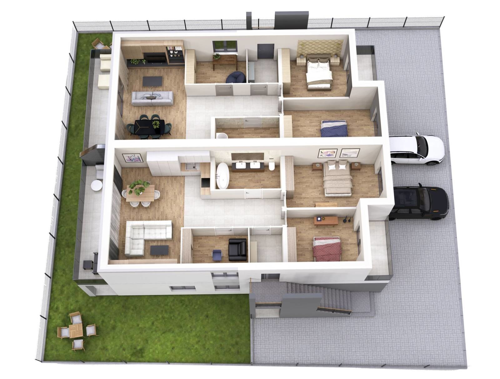 Inwestycja składa się z jednego budynku z czterema samodzielnymi lokalami mieszkalnymi, z własnym garażem w bryle budynku, oraz dużych ogródków dla apartamentów na parterze.
