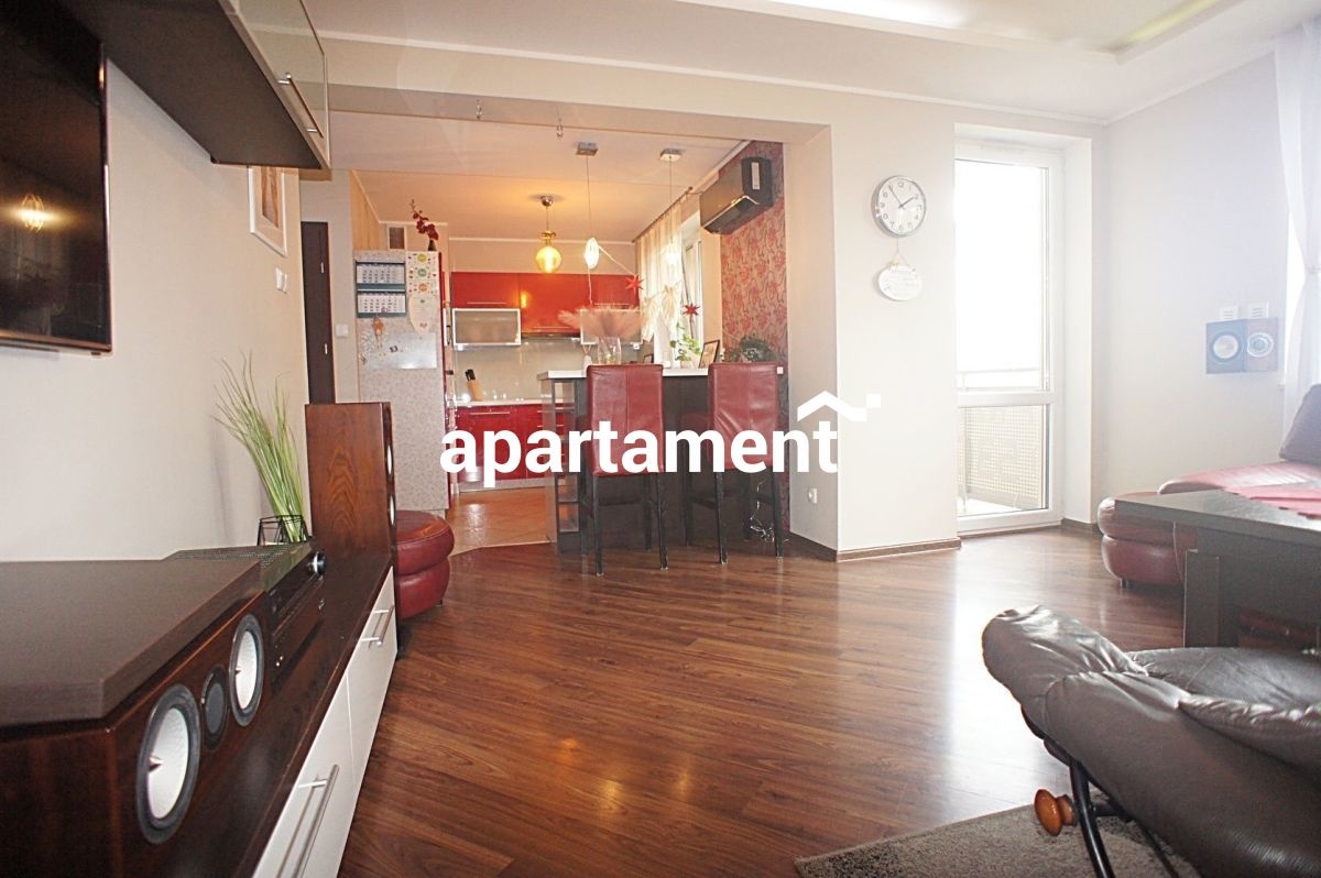 - Salon połączony z kuchnią, z wyjściem na duży balkon od strony zachodniej, wyposażony w klimatyzację - idealne miejsce na relaks i spotkania.