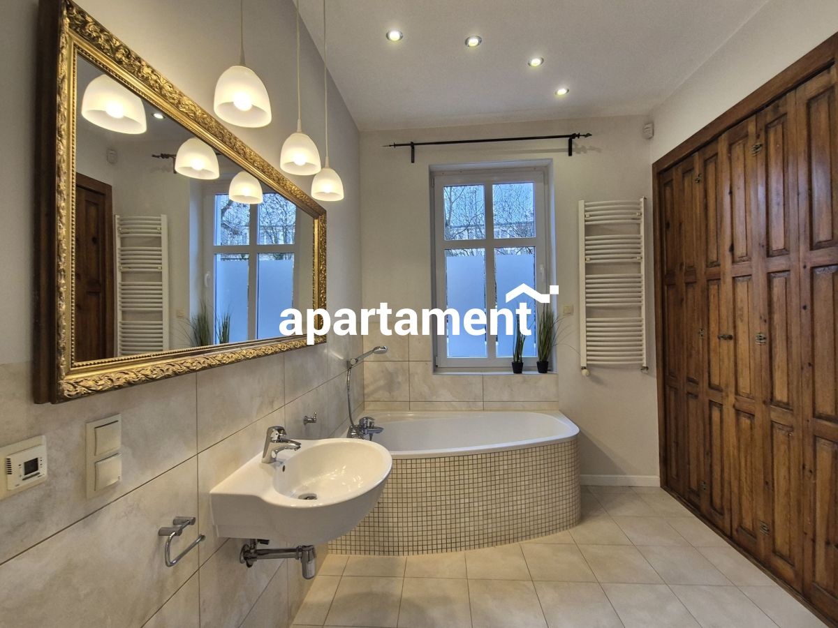 - Duża łazienka z oknem, wyposażona zarówno w wannę, jak i prysznic, z ukrytą zabudową na chemię i ręczniki.